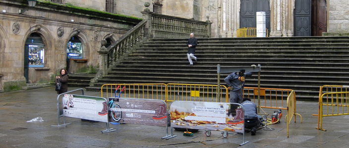 El Consorcio de Santiago mantiene el programa A pedra que pisas, para la conservación y reparación de los enlosados de granito de la Ciudad Histórica de Santiago de Compostela. Diferentes equipos de trabajo, formados por canteros especializados en la conservación de pavimentos históricos, reparan y mantienen a lo largo del año las calles del casco histórico.