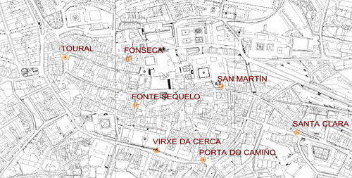 Intervención: rehabilitación y puesta en valor del tejido de siete fuentes de la ciudad histórica de Santiago, de gran presencia en la historia y urbanismo de Santiago. Las fuentes intervenidas son: San Martiño Pinario, Fonte Sequelo, Porta do Camiño, Toural, Fonseca, Santa Clara y Virxe da Cerca.